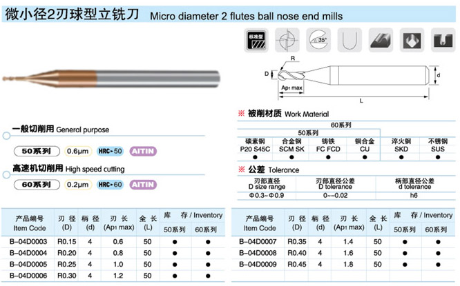 微小徑2刃球型立銑刀