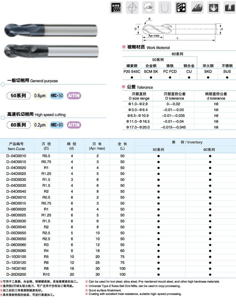 2/4刃球型立銑刀